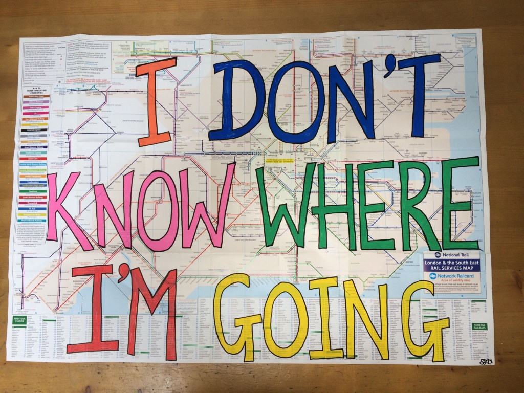 ‘I Don’t Know Where I’m Going’ by Harper Bizarre Art, 2020. Acrylics on a National Rail map.